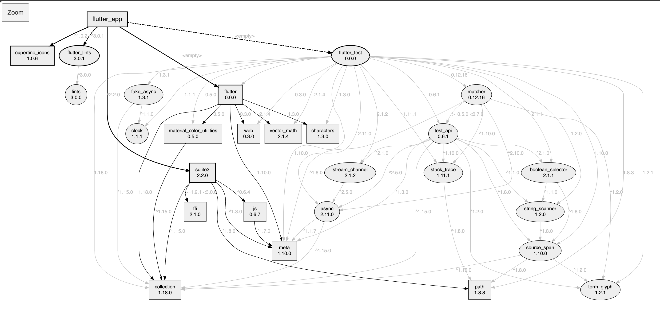 In this example, we can see that sqlite3 package is using meta which can include any version from 1.3.0 to 2.0.0. We need to then find the meta package to see what the version is. If there are a lots of packages, it's difficult to check transitive dependencies this way. We can use pubviz to generate a visual dependency graph which clearly shows the effective version.