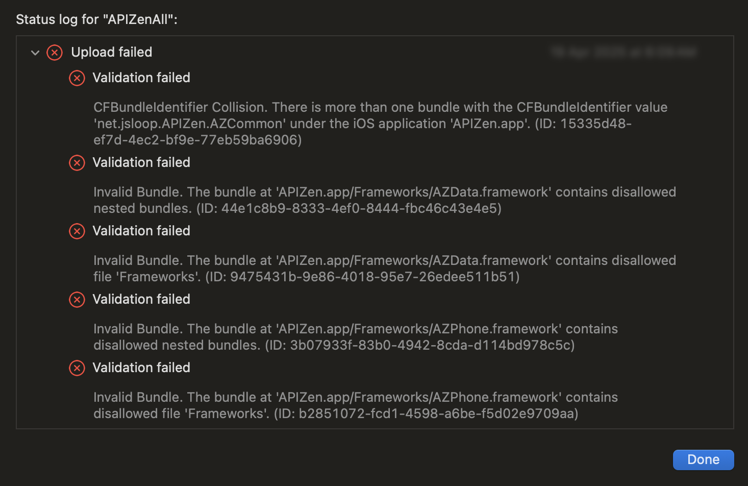 With an example, let's say I have AZData.framework and AZCommon.framework. I need the AZCommon.framework in AZData.framework and I need it in the main app also. If I embed AZCommon.framework in the AZData.framework it results in duplicate framework. In this case we can include the common framework in the data framework but not embed and only embed these two frameworks in the main app. This should fix the issue.