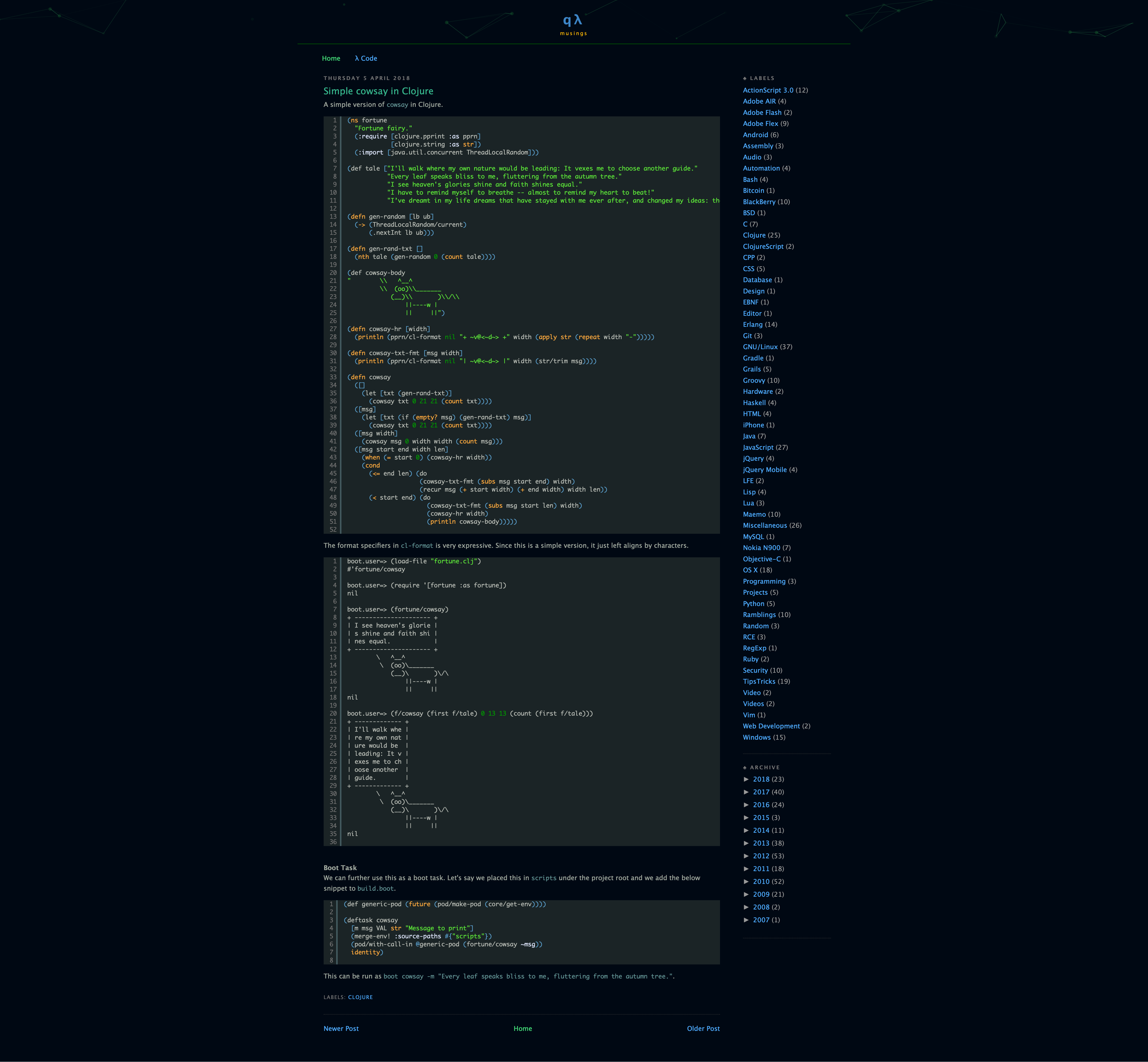 I changed the color schemes to this theme in around 2012-13 and it remained the same till 2018. All posts were displayed in full in the home page with pagination. I also had a particles effect added towards the end in the header. It's readable on mobile, but is not mobile friendly. It requires a layout customization for the theme which is difficult because this theme did not have any mobile specific view.